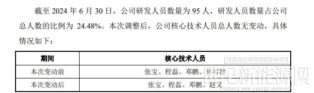 本次变动后,帕瓦股份核心技术人员为张宝、程磊、邓鹏、赵义4人。截止2024年6月末,帕瓦股份研发人员数量为95人,占公司人员总数的比例为24.48%。