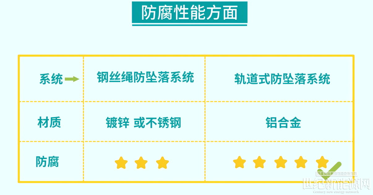 钢丝绳防坠落系统采用的是镀锌或不锈钢材质,轨道式防坠落系统采用的是铝合金材质,防腐性能更优。