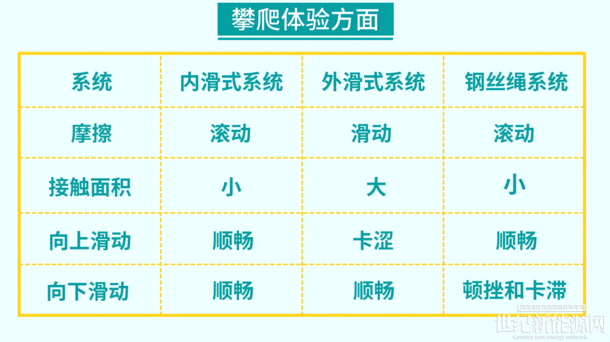 钢丝绳系统:采用滚动摩擦,滚轮与钢丝绳接触面积小,向上滑动时很顺畅,向下滑动时容易出现顿挫和卡滞现象。