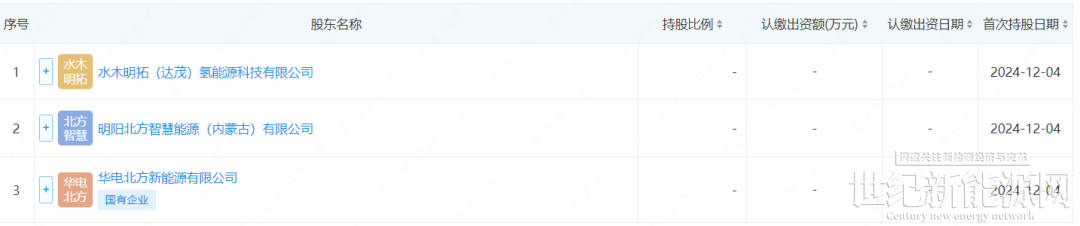 股权全景穿透图显示,该公司由华电新能源旗下华电北方新能源有限公司、水木明拓(达茂)氢能源科技有限公司、明阳智能旗下明阳北方智慧能源(内蒙古)有限公司共同持股。