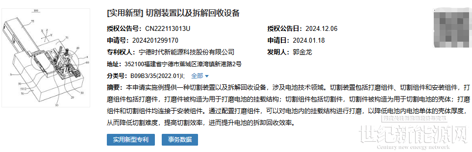 据国家知识产权局12月6日的公告信息,宁德时代新能源科技股份有限公司取得一项名为“切割装置以及拆解回收设备”的专利,授权公告号CN222113013U,申请日期为2024年1月18日。
