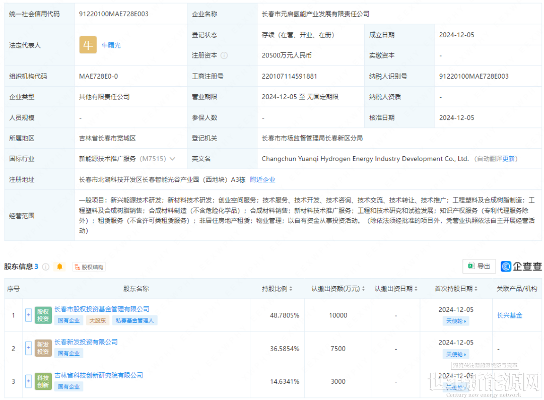 企查查信息显示,长春市元启氢能产业发展有限责任公司于12月5日成立,注册资本20500万元。经营范围为新兴能源技术研发;新材料技术研发;创业空间服务;技术服务、技术开发、技术咨询、技术交流、技术转让、技术推广;工程塑料及合成树脂制造;工程塑料及合成树脂销售;合成材料制造(不含危险化学品);合成材料销售;新材料技术推广服务;工程和技术研究和试验发展;知识产权服务(专利代理服务除外);租赁服务(不含许可类租赁服务);非居住房地产租赁;物业管理;以自有资金从事投资活动。