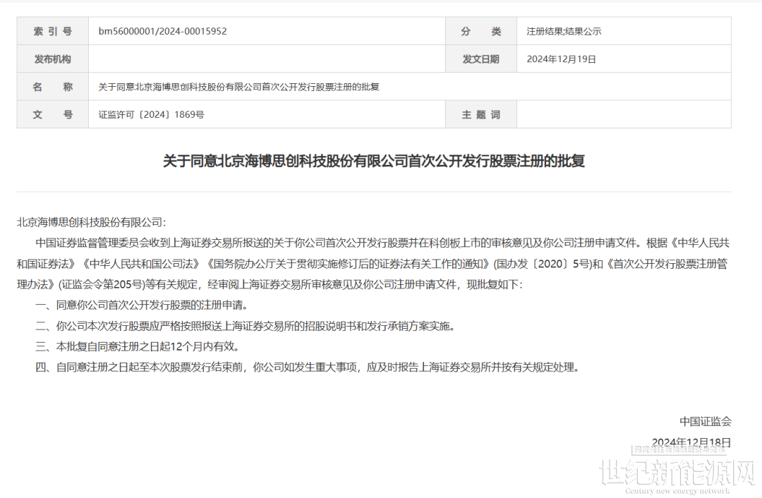 12月19日,证监会官网显示,北京海博思创科技股份有限公司IPO注册生效,保荐机构为中泰证券股份有限公司,审计机构为中汇会计师事务所(特殊普通合伙),律师事务所为国浩律师(上海)事务所。
