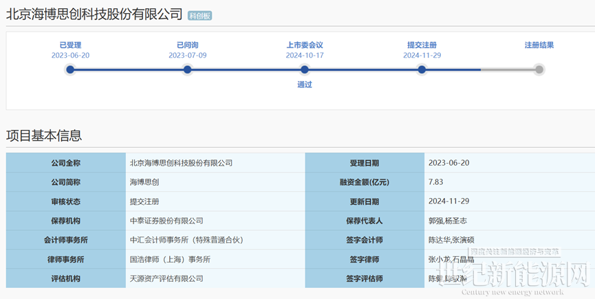 11月29日,上交所官网显示,北京海博思创科技股份有限公司IPO提交注册,保荐机构为中泰证券股份有限公司。