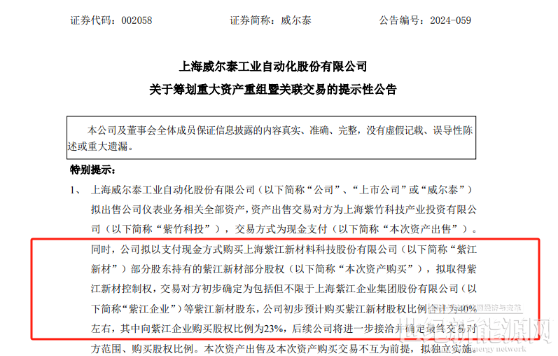 近日,威尔泰发布“关于筹划重大资产重组暨关联交易的提示性公告”,其中提及拟以支付现金方式购买紫江新材部分股权,拟取得紫江新材控制权。公司初步预计购买紫江新材股权比例合计为40%左右,其中向紫江企业购买股权比例为23%。
