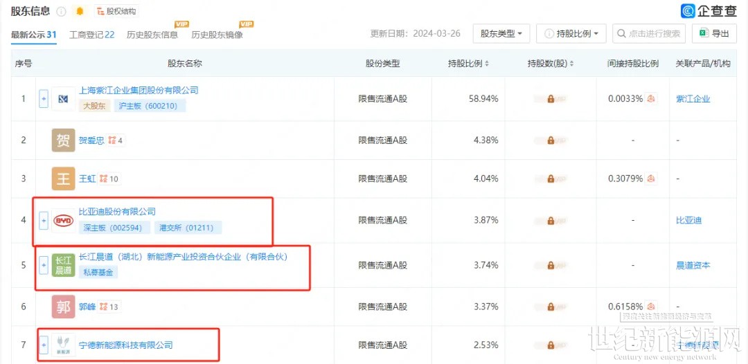 根据其股东信息公示,其股东包括比亚迪、宁德新能源及长江晨道(湖北)等知名企业,其持股分别为3.87%、3.74%、2.53%;其中长江晨道(湖北)的大股东由宁德时代全资持股。