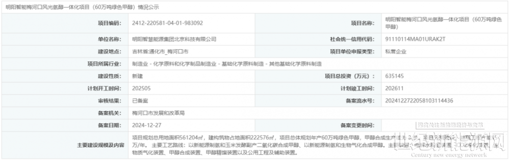 12月27日,吉林省投资项目在线审批监管平台相关信息显示,明阳智能梅河口风光氢醇一体化项目(60万吨绿色甲醇)完成备案。