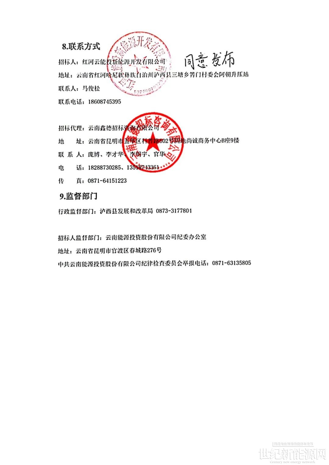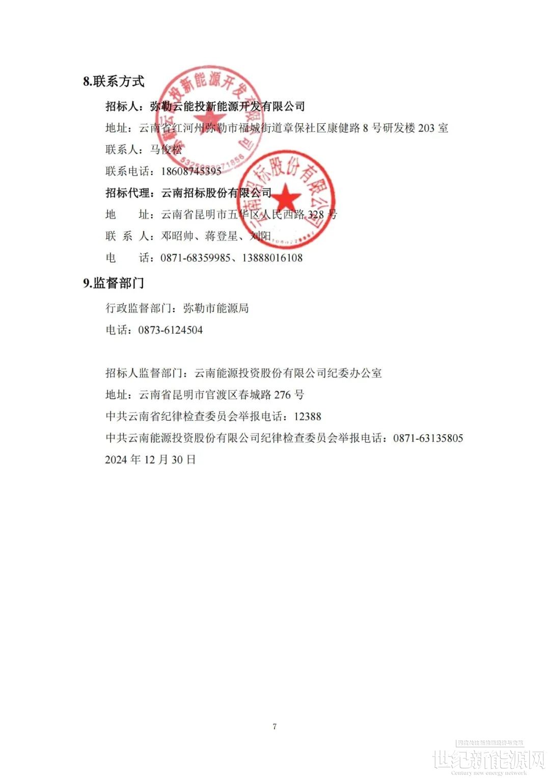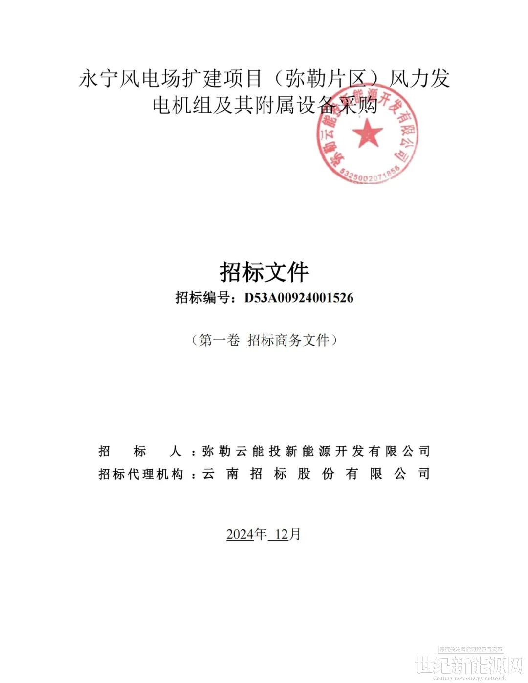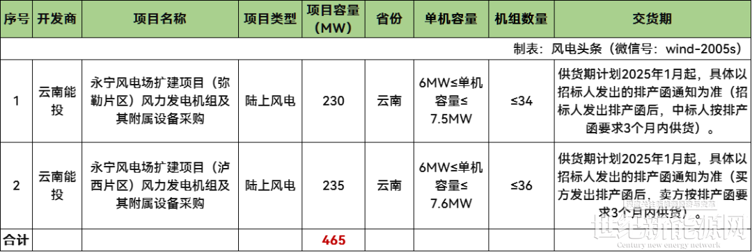 12月30日、31日,永宁风电场扩建项目(弥勒片区、泸西片区)风力发电机组及其附属设备采购招标公告发布,规模总计465MW,6MW≤单机容量≤7.5MW。