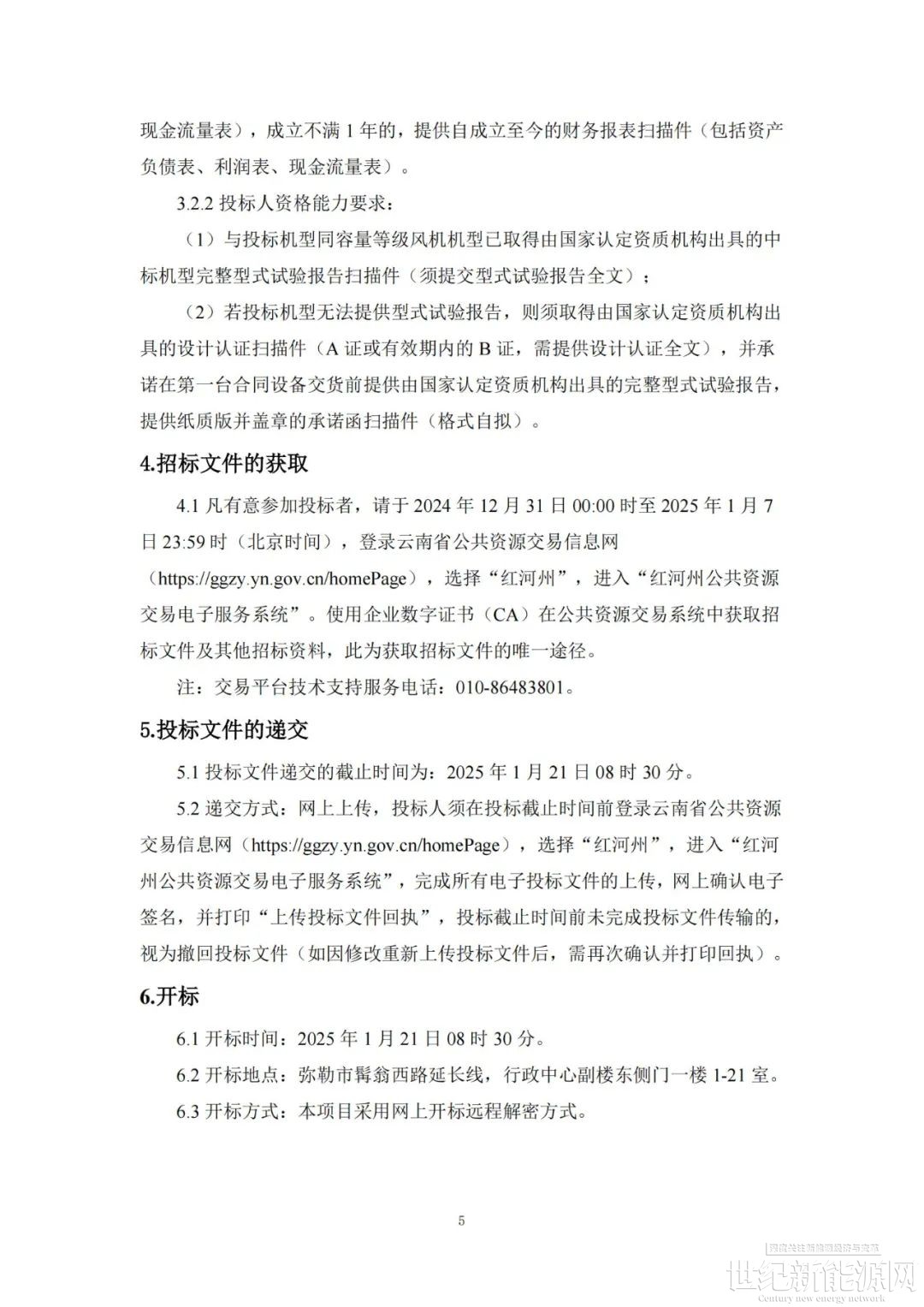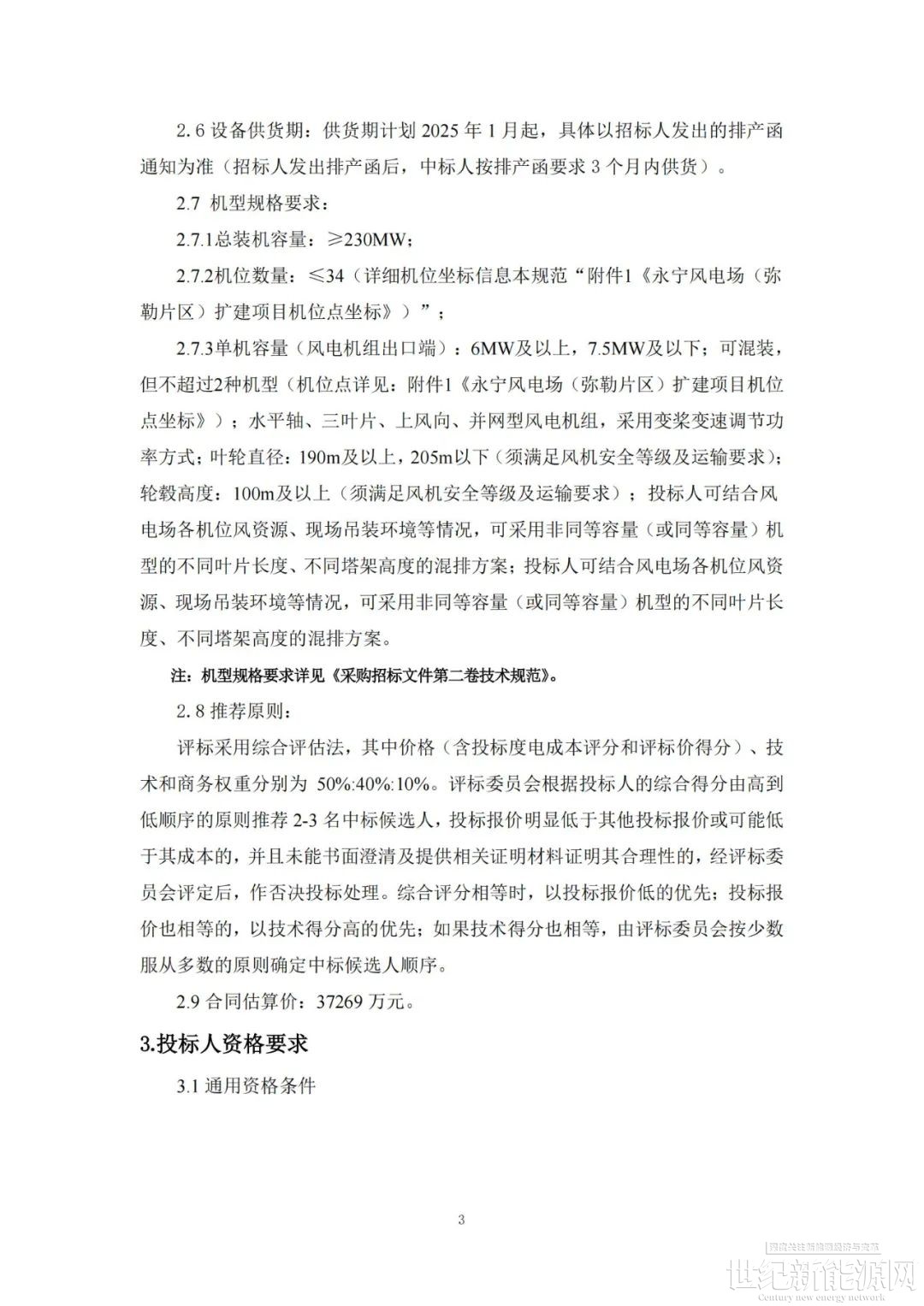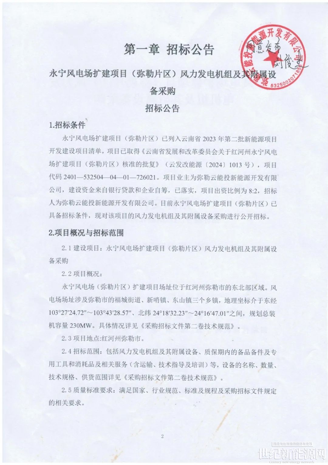 根据招标公告,永宁风电场(弥勒片区)扩建项目场址位于红河州弥勒市的东北部区域,总装机容量≥230MW;机位数量≤34;单机容量6MW及以上,7.5MW及以下,可混装,但不超过2种机型;叶轮直径:190m及以上,205m以下(须满足风机安全等级及运输要求);轮毂高度:100m及以上(须满足风机安全等级及运输要求)。设备供货期:供货期计划2025年1月起,具体以招标人发出的排产函通知为准(招标人发出排产函后,中标人按排产函要求3个月内供货)。