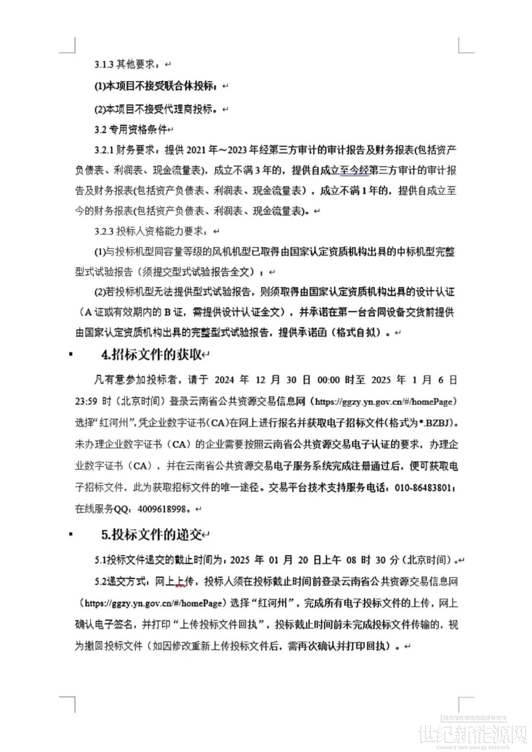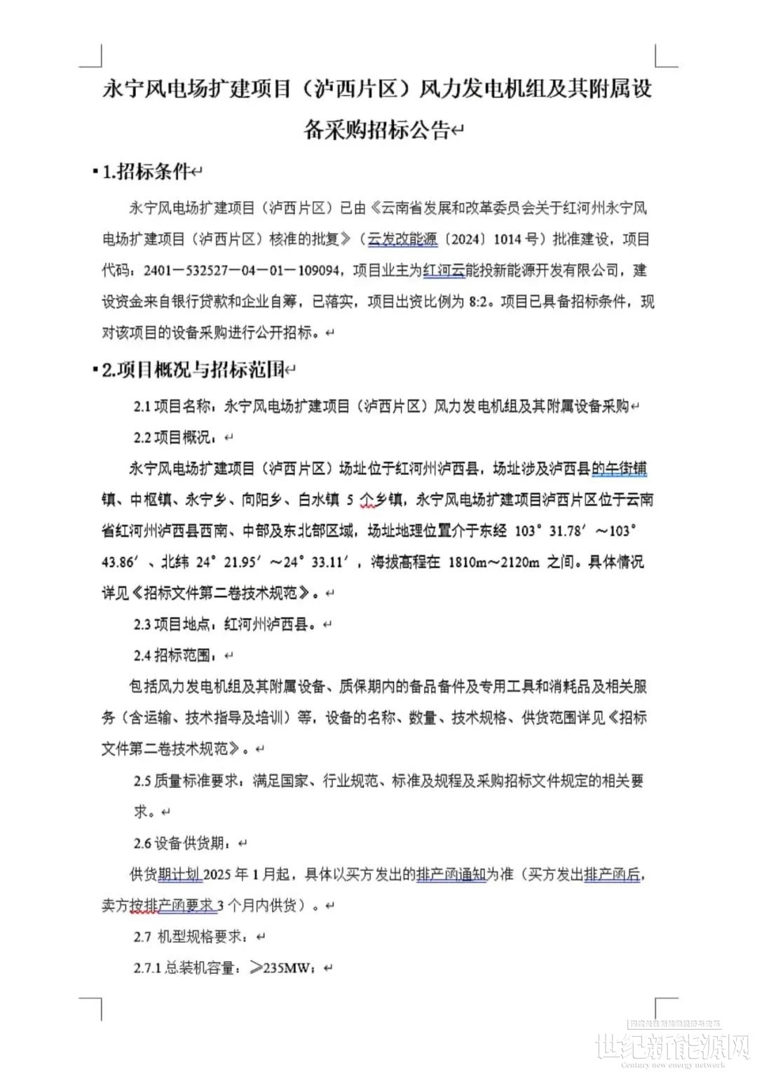 永宁风电场扩建项目(泸西片区)场址位于红河州泸西县,总装机容量≥235MW;机位数量≤36;单机容量6.0MW及以上,7.5MW及以下,可混装,但不超过2种机型;叶轮直径:190m及以上,205m以下(须满足风机安全等级及运输要求);轮毂高度:100m及以上(须满足风机安全等级及运输要求)。设备供货期:供货期计划2025年1月起,具体以招标人发出的排产函通知为准(买方发出排产函后,卖方按排产函要求3个月内供货)。