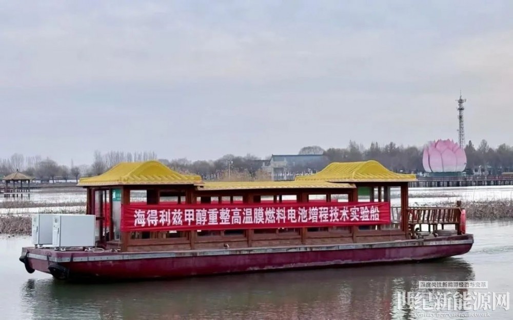 1月13日下午,在雄安新区白洋淀景区内,搭载海得利兹?甲醇重整高温膜燃料电池动力增程系统的观光船在景区水域首航成功,破冰前行。