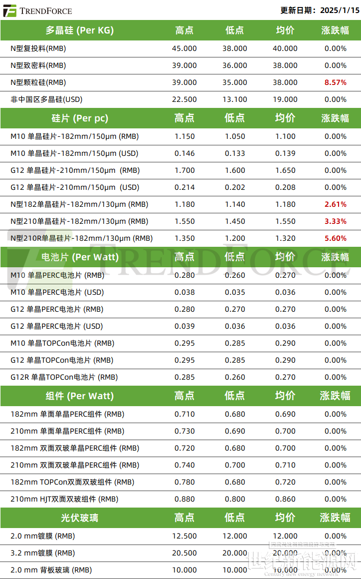 根据TrendForce集邦咨询新能源研究中心1月15日最新报价,N型复投料主流成交价格保持在40元/KG,N型致密料主流成交价格为38元/KG,N型颗粒硅报价从35元/KG上涨至38元/KG,涨幅高达8.57%。