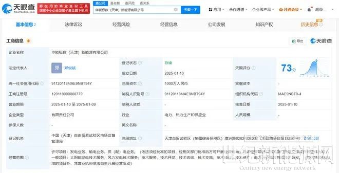 近日,华能极数(天津)新能源有限公司成立,法定代表人为郑俊斌,注册资本1000万元人民币,经营范围包括太阳能发电技术服务、风力发电技术服务、电力行业高效节能技术研发等。股东信息显示,该公司由华能新能源股份有限公司、极数能源(天津)集团有限公司共同持股。