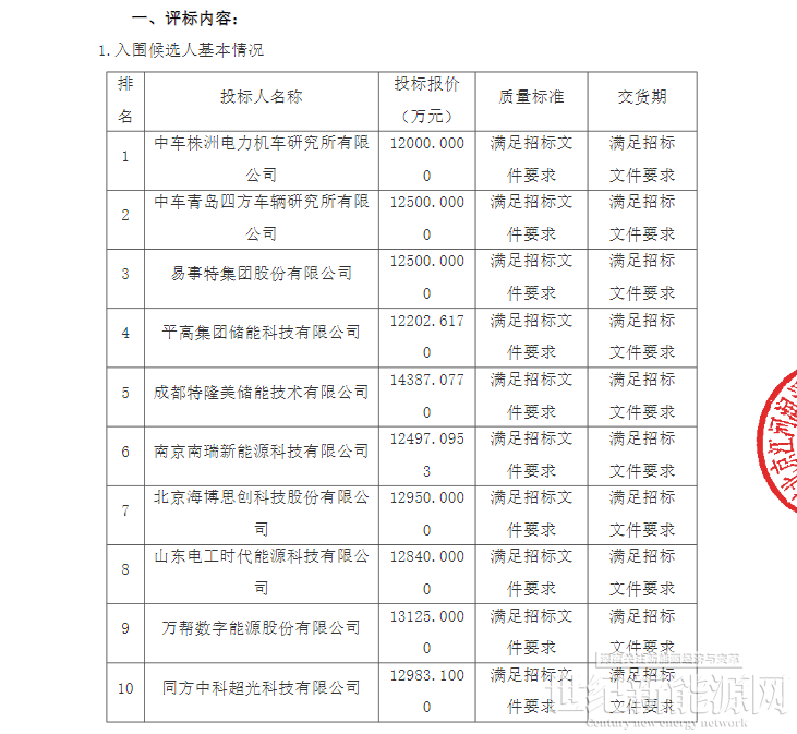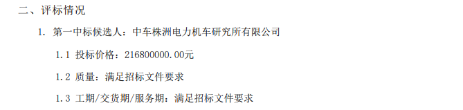 中标候选人第1名:中车株洲电力机车研究所有限公司,投标报价21680万元,折合单价0.542元/Wh;