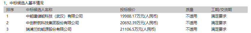 第一中标候选人为中能建储能科技(武汉)有限公司,投标报价19988.17万元,折合单价0.999元/Wh;