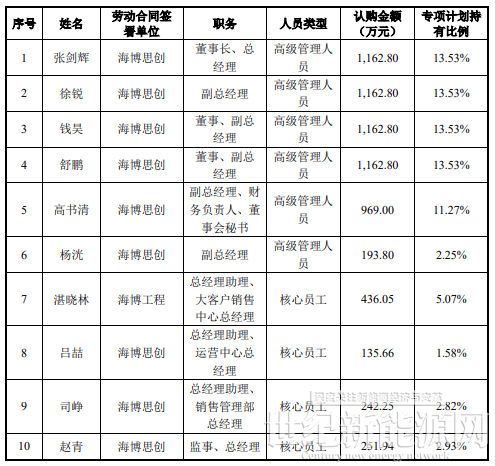 海博思创员工资管计划获配股份数量为4,435,000股,占本次公开发行股份数量的9.98%,获配金额85,950,300.00元。参与人姓名、职务与比例如下: