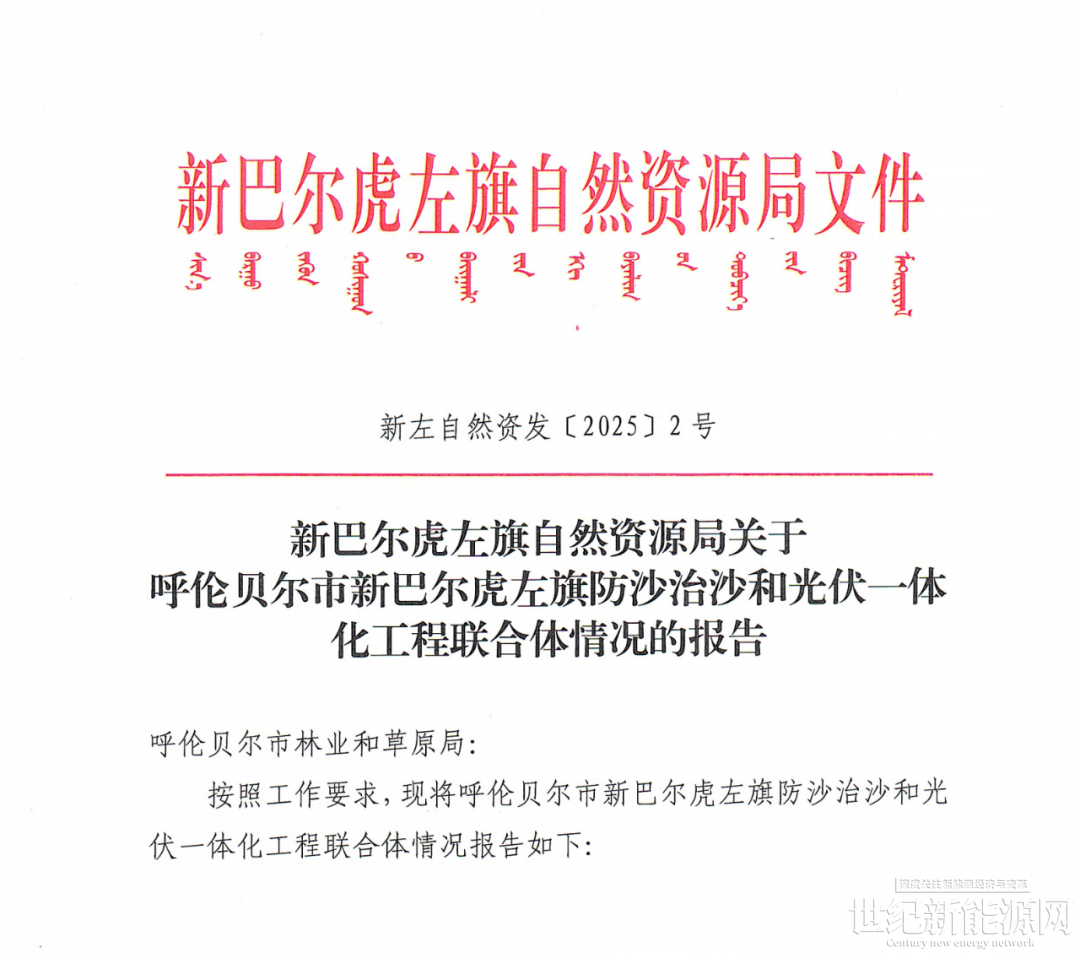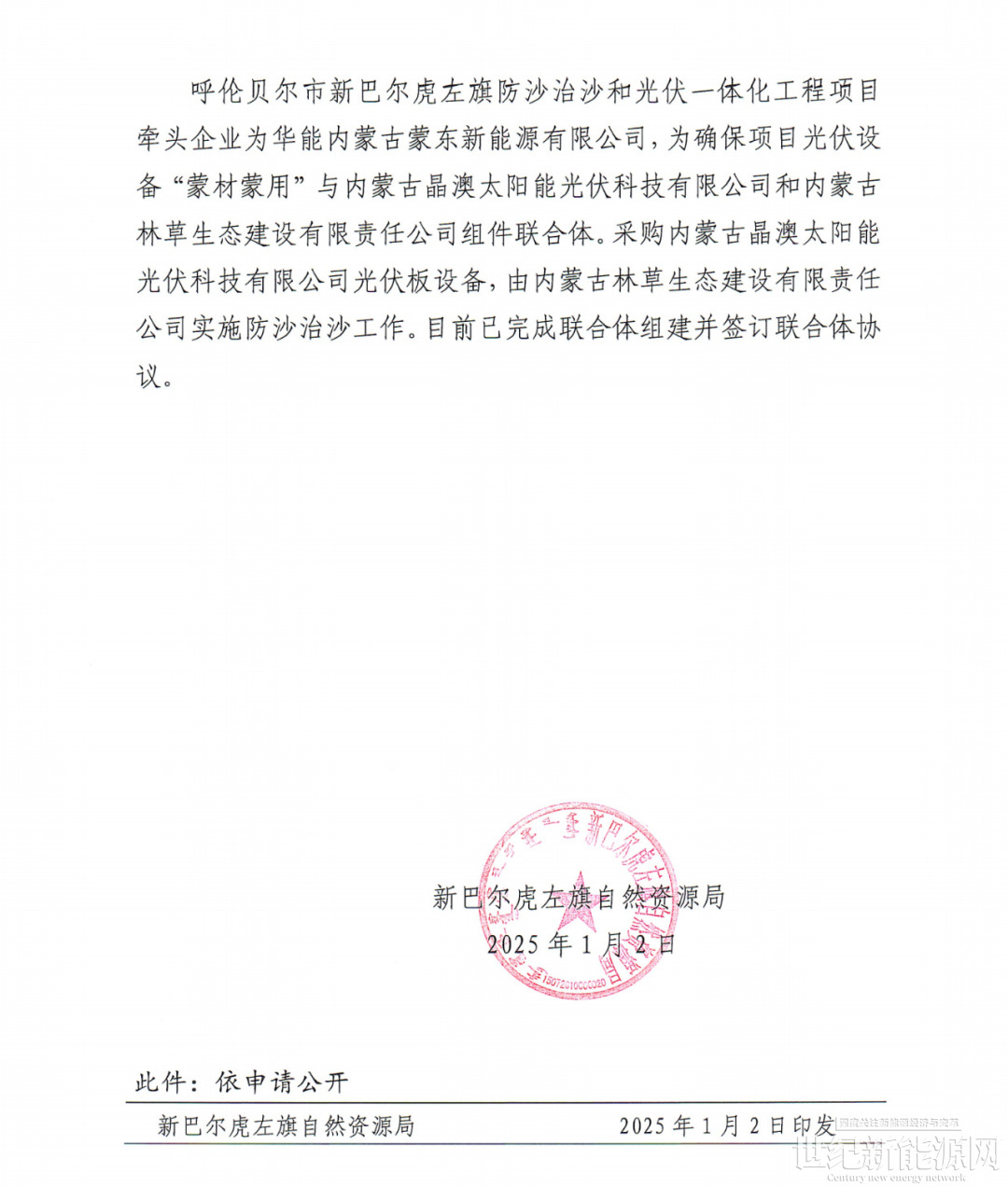 近日,内蒙古呼伦贝尔市新巴尔虎左旗自然资源局下发《关于呼伦贝尔市新巴尔虎左旗防沙治沙和光伏一体化工程联合体情况的报告》,报告指出:呼伦贝尔市新巴尔虎左旗防沙治沙和光伏一体化工程项目,已完成联合体组建并签订联合体协议。牵头企业为:华能内蒙古蒙东新能源有限公司,为确保项目光伏设备“蒙材蒙用”与内蒙古晶澳太阳能光伏科技有限公司和内蒙古林草生态建设有限责任公司组件联合体。