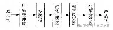 其工艺过程为(见下图):原料甲醇进入缓冲罐,然后进入换热器进行升温,再进入汽化过热器,用高温导热油进行汽化。然后进入列管反应器,在催化剂的的作用下进行裂解和变换,生产一氧化碳和氢气。