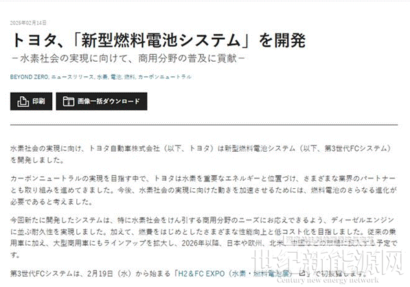 2月14日,丰田发布了第三代燃料电池系统,并将于2月19日在东京举行的国际氢气与燃料电池博览会上正式亮相,在2026年后推出。自2014年推出氢能源车Mirai以来,丰田在全球已售出约28000辆氢燃料电池车型,其研发的燃料电池系统还广泛用于超过2700个不同领域,涵盖公交车、发电机等多种设备。