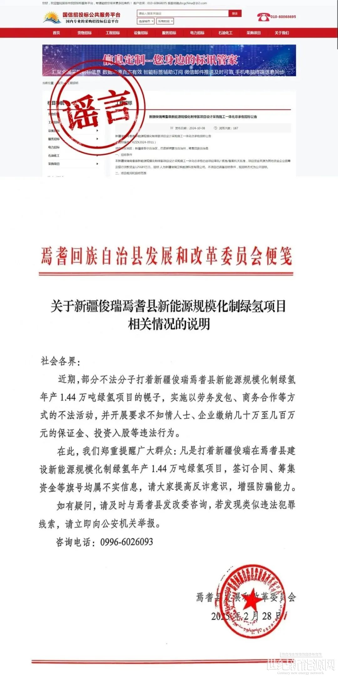经与相关部门核实,凡是以“新疆俊瑞焉耆县新能源规模化制绿氢年产1.44万吨绿氢项目”名义签订合同、募集资金或发布融资信息的,均属不实信息。