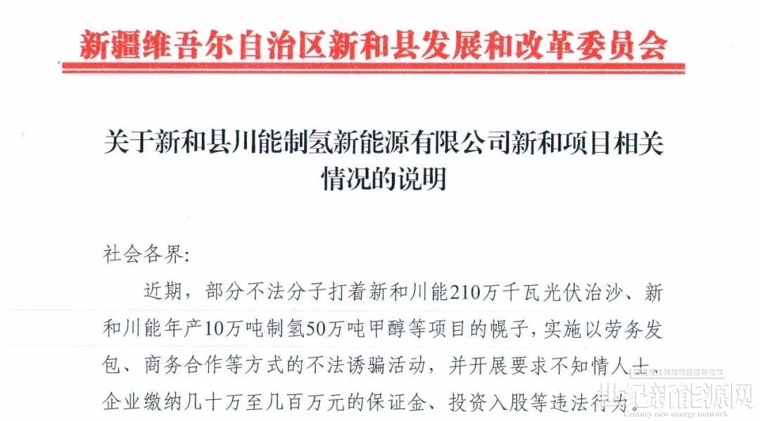 这不是新疆首次发布辟谣信息,在此之前,新疆新和县发改委曾发布相关声明:凡是以“新和县川能210万千瓦光伏治沙”“新和川能年产10万吨制氢50万吨甲醇(含储能、光伏治沙、源网荷储等)项目”名义签订合同、招募资金或发布融资信息的,均属不实信息。