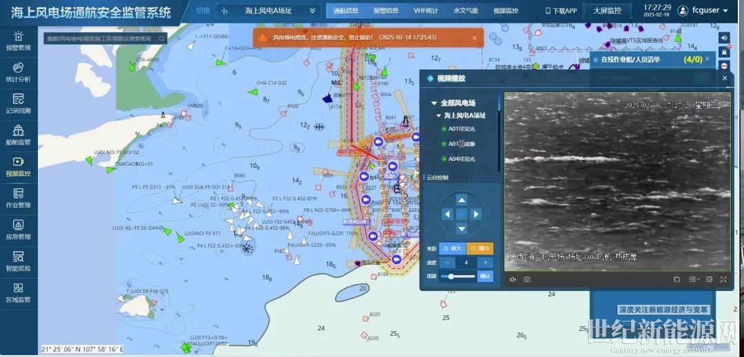 项目安全专责潘业源表示,“通过设置电子围栏,一旦有未经授权的船只靠近风电场运行区域,系统立刻就能感知,并第一时间发送警告信息,为后续响应提供信息支撑。”电子围栏的应用,有效防止非法入侵行为的发生,并通过智能视频AI分析系统,实现对风险事件的事前预警防范、事中跟踪处理和事后回放追责,提高整体安全管理水平。
