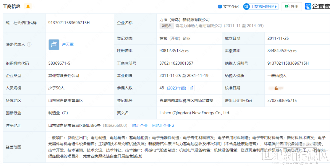 力神青岛全称为“力神(青岛)新能源有限公司”,成立于2011年11月,法定代表人卢天军,注册资本约9.08亿元,公司大股东为成立了27年之久的天津力神电池股份有限公司,力神电池是国内首家锂离子电池研发与制造企业,其储能业务最早从2010年开始布局,是国内最早涉足储能领域的企业之一。