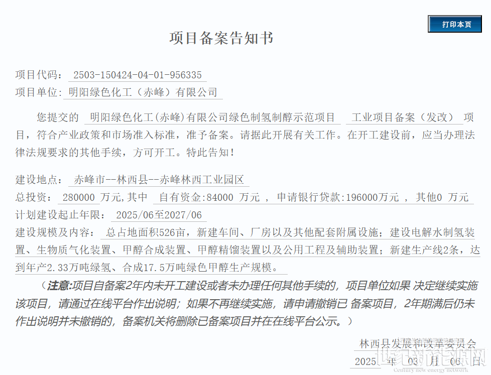 3月6日,内蒙古赤峰市林西县发改委发布《项目备案告知书》,准予明阳绿色化工(赤峰)有限公司绿色制氢制醇示范项目备案。