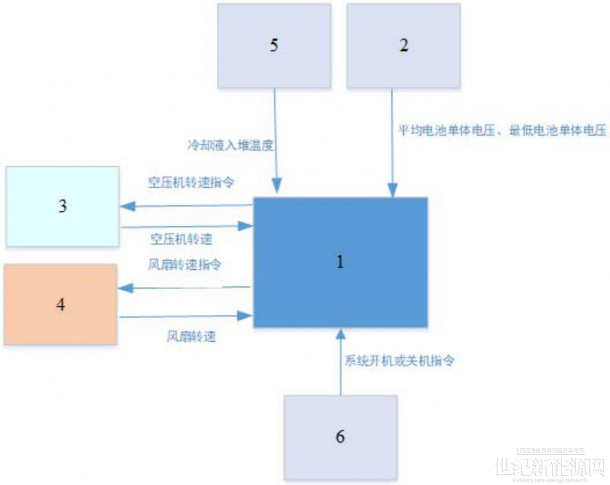 氢燃料电池防阴极水堵系统及控制方法专利摘要显示,提供一种氢燃料电池防阴极水堵系统及控制方法,该系统包括:燃料电池系统控制单元FCU、电堆巡检CVM、空气压缩机、以及散热风扇;其中,电堆巡检CVM将采集到的电压信号发送至燃料电池系统控制单元FCU,燃料电池系统控制单元FCU用于确定平均电池单体电压是否大于最低电池单体电压超过一阈值;在确定平均电池单体电压大于最低电池单体电压超过一阈值的情况下,控制增加所述空气压缩机的转速;增加冷却液目标入堆温度,并降低散热风扇的转速。本公开可以及时识别燃料电池阴极侧水堵情况,并通过增加空气流量或提高温度的方式快速排出阴极侧残留的水分,防止由于阴极侧水堵导致的紧急停机,提高氢燃料电池系统的稳定性。