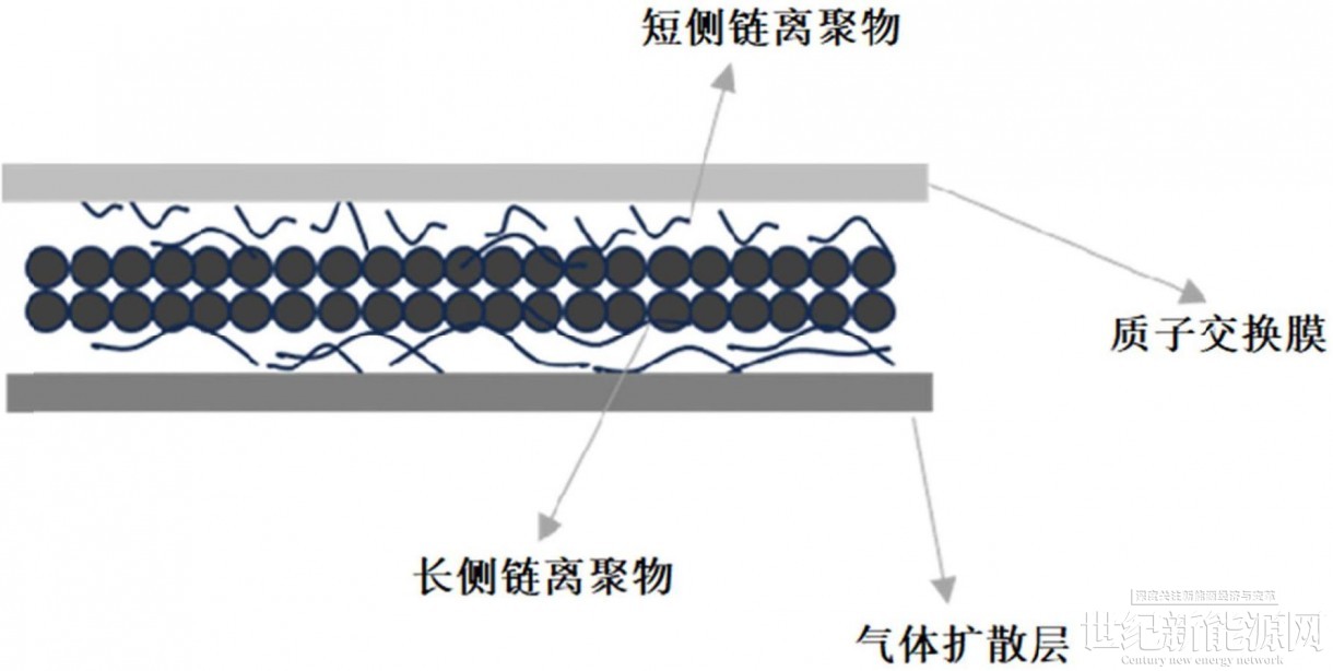 膜电极及其制备方法和应用专利涉及燃料电池领域,公开了一种膜电极及其制备方法和应用。该方法包括:在质子交换膜的两侧表面分别层叠设置功能层,以得到依次含有第一气体扩散层、第一阴极浆料层、第二阴极浆料层、质子交换膜、阳极催化剂层和第二气体扩散层的膜电极;第一阴极浆料层和第二阴极浆料层分别由浆料A和浆料B涂覆形成;阳极催化剂层由浆料C涂覆形成;浆料A、浆料B、浆料C中均含有醇溶剂、水、全氟磺酸聚合物和铂碳催化剂;且浆料A中含有的全氟磺酸聚合物的离子交换当量值比浆料B中含有的全氟磺酸聚合物的离子交换当量值高至少200。本发明提供的制备膜电极的方法提高了催化剂利用率,减少了传质损失,是实现高功率输出和长寿命的有效策略。