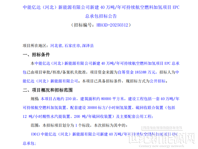 3与21日,中能亿达(河北)新能源有限公司新建40万吨/年可持续航空燃料加氢项目EPC总承包招标公告发布。