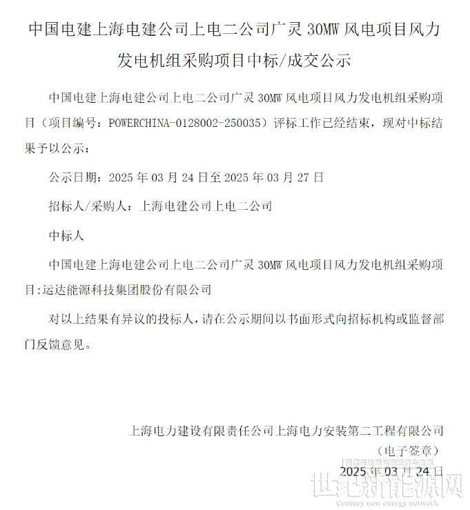 3月24日,中国电建上海电建公司上电二公司广灵30MW风电项目风力发电机组采购项目入围公示,运达股份中标。