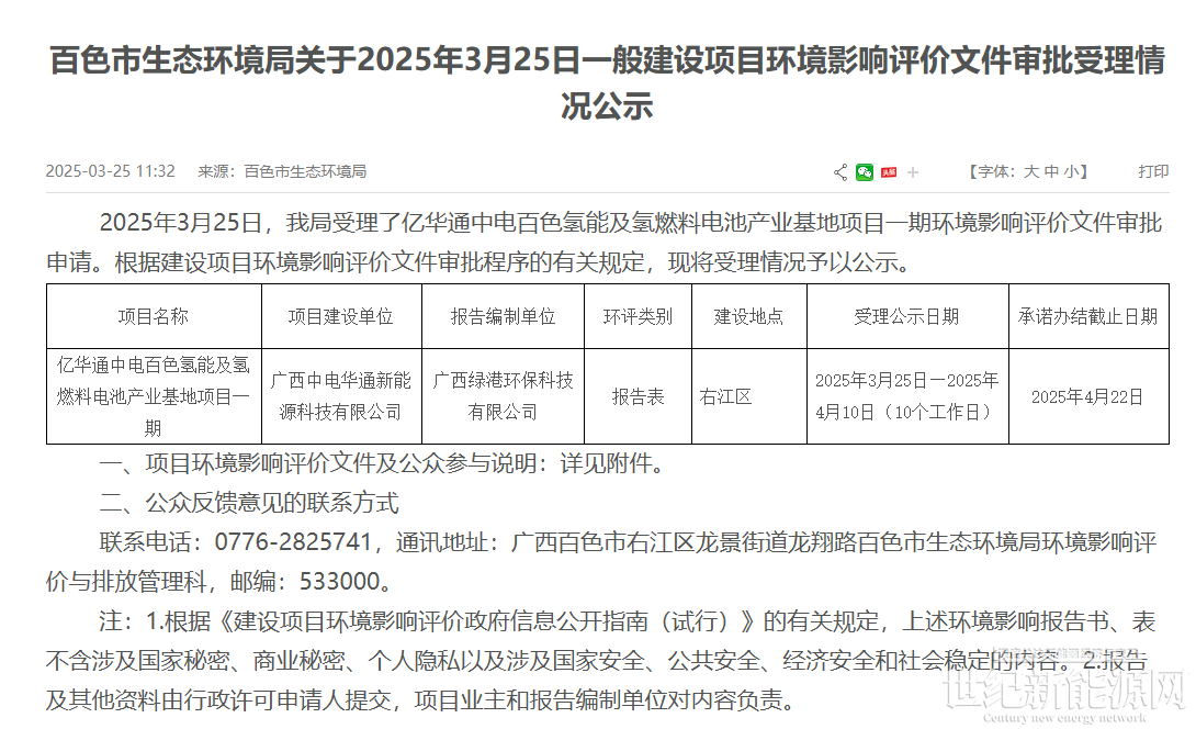 2025年3月25日,广西百色市生态环境局受理了亿华通中电百色氢能及氢燃料电池产业基地项目一期环境影响评价文件审批申请。