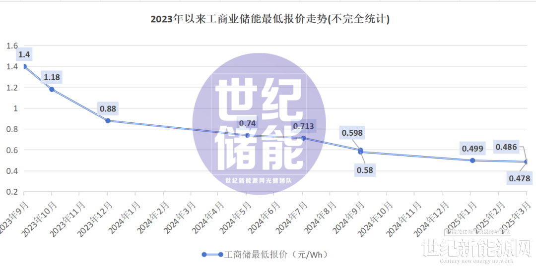 2025年工商业储能市场价格竞争愈发激烈。1月10日,博时新能源联合瑞浦兰钧、高特电子、恩玖科技,共同推出的某款工商业储能柜,售价低至0.499元/Wh,打响了新年价格战的 “第一枪”。3月20日又出现了0.486元/Wh的价格刷新记录,仅过了一周,长园能源的报价“0.478元/Wh起”再创新低。