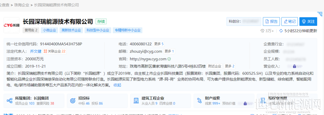 企查查显示,长园能源实现了新型电力系统“源-网-荷”业务的协同布局,可为客户提供包含新能源发电、新型储能、综合能源、智能配用电、电/碳市场辅助服务等五大产品系列在内的一体化解决方案。