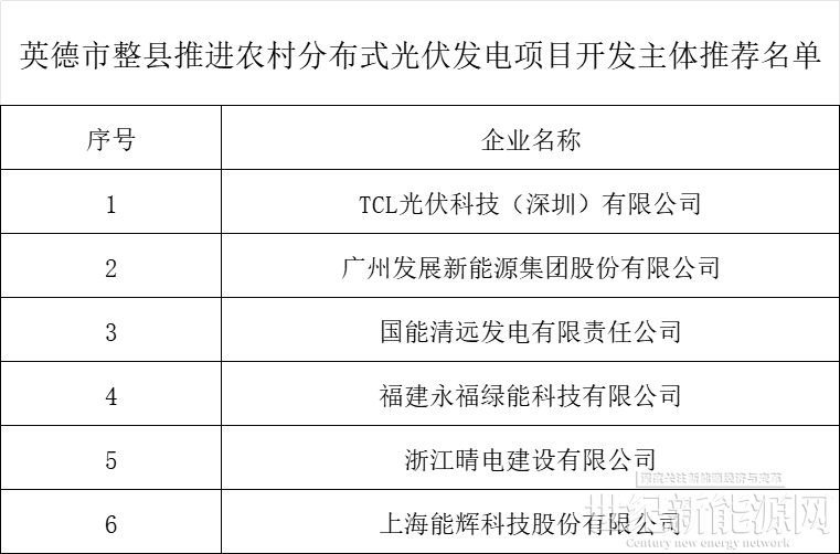 根据公告,英德市决定以整县为单位统筹推进英德市农村分布式光伏发展。支持具备条件的镇村采取“公司+镇村+农户”等模式,统一规划设计、打包备案,开展整镇村分布式光伏开发建设,确保建成后运营维护可持续。遴选内容为拟选定6家实力强、具备丰富行业经验的整县推进农村分布式光伏发电项目开发主体推荐名单。