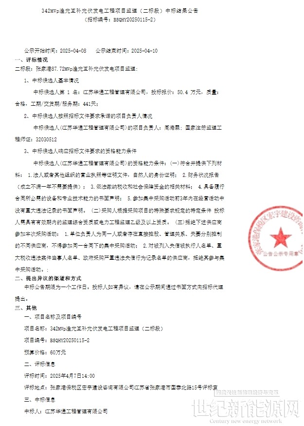 4月8日,342MWp渔光互补光伏发电工程项目监理(二标段)中标结果公示。