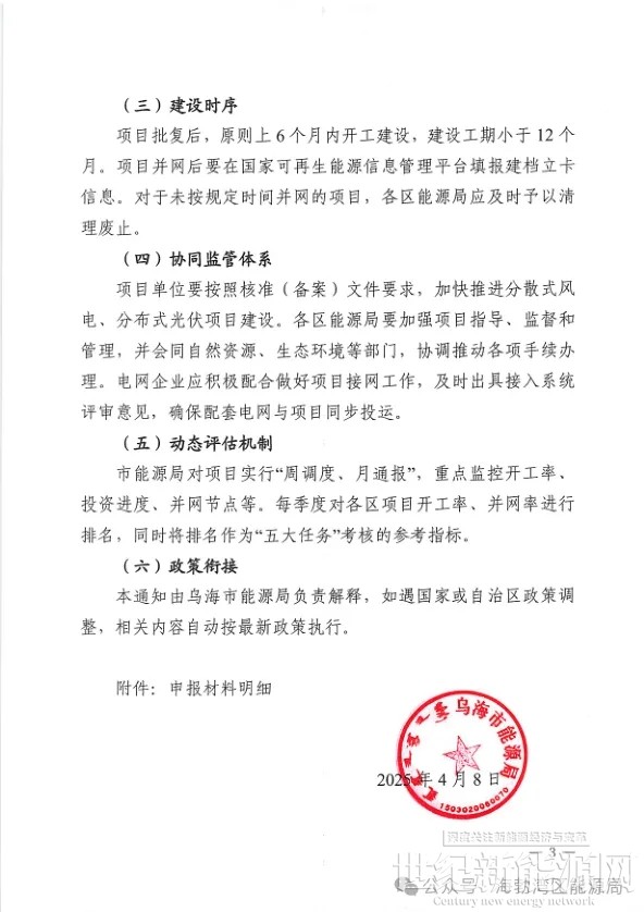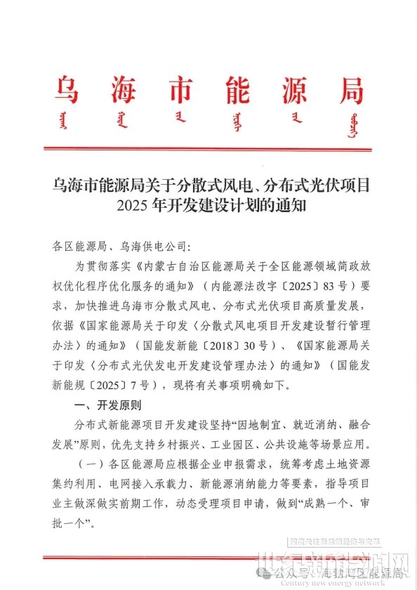 4月8日,内蒙古乌海市能源局发布关于分散式风电、分布式光伏项目2025年开发建设计划的通知。