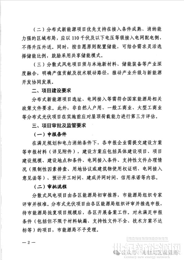 分布式新能源项目选址、电网接入等需符合国家能源局相关政策文件要求。此外,非自然人户用、一般工商业、大型工商业等分布式光伏项目在实施前应对屋顶荷载能力进行第三方评估。