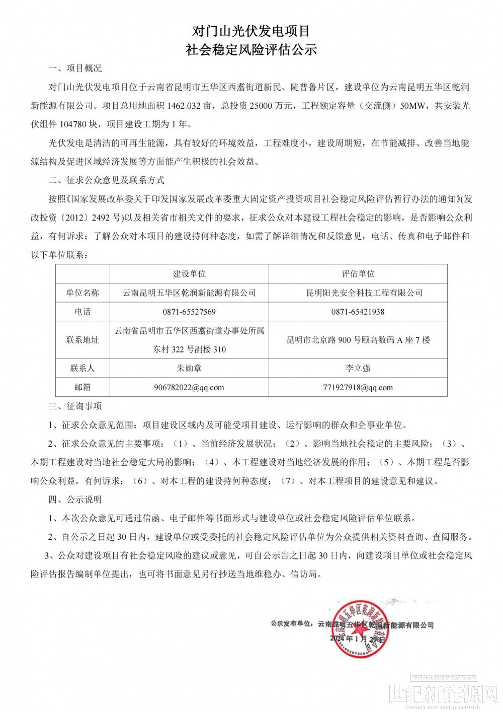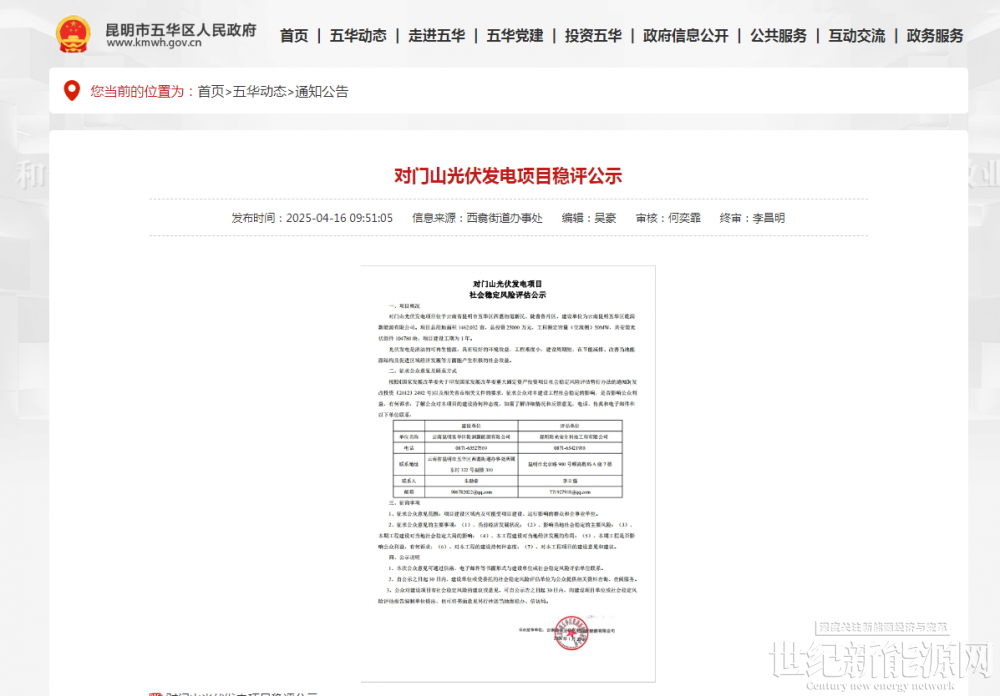 4月16日,云南省昆明市五华区西翥街道办事处发布对门山光伏发电项目社会稳定风险评估公示。