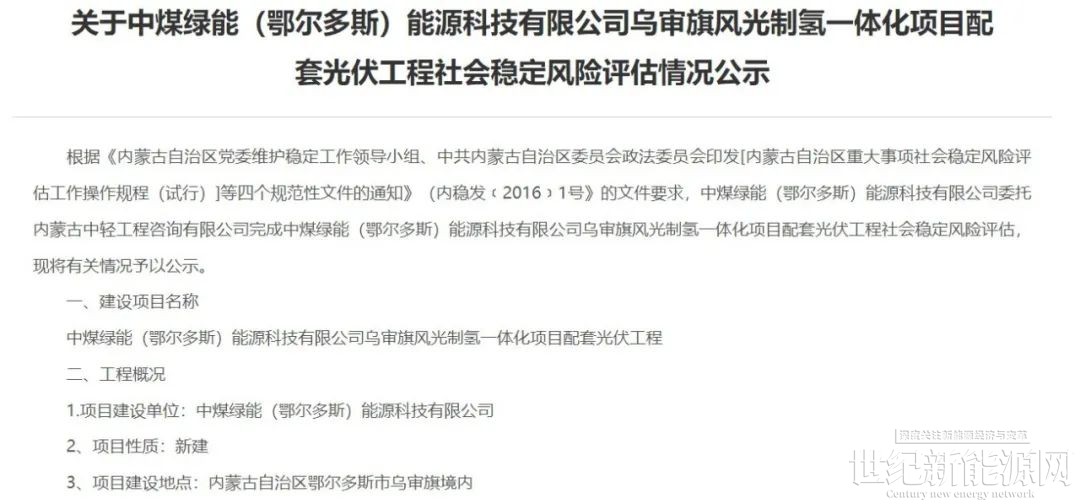 据悉,近日,内蒙古乌审旗人民政府发布关于中煤绿能(鄂尔多斯)能源科技有限公司乌审旗风光制氢一体化项目配套光伏工程社会稳定风险评估情况公示。