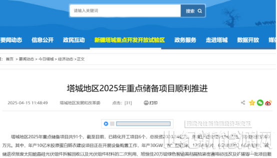 4月15日,新疆塔城地区发改委发布消息称,塔城地区2025年重点储备项目共91个,截至目前,已转化开工项目6个。其中含年产30GW“N”型硅棒、12GW切片、6GW电池、6GW组件、首储退役报废太阳能晶硅光伏组件拆解回收以及光伏组件材料的二次利用项目在内的一批项目顺利落地实施。