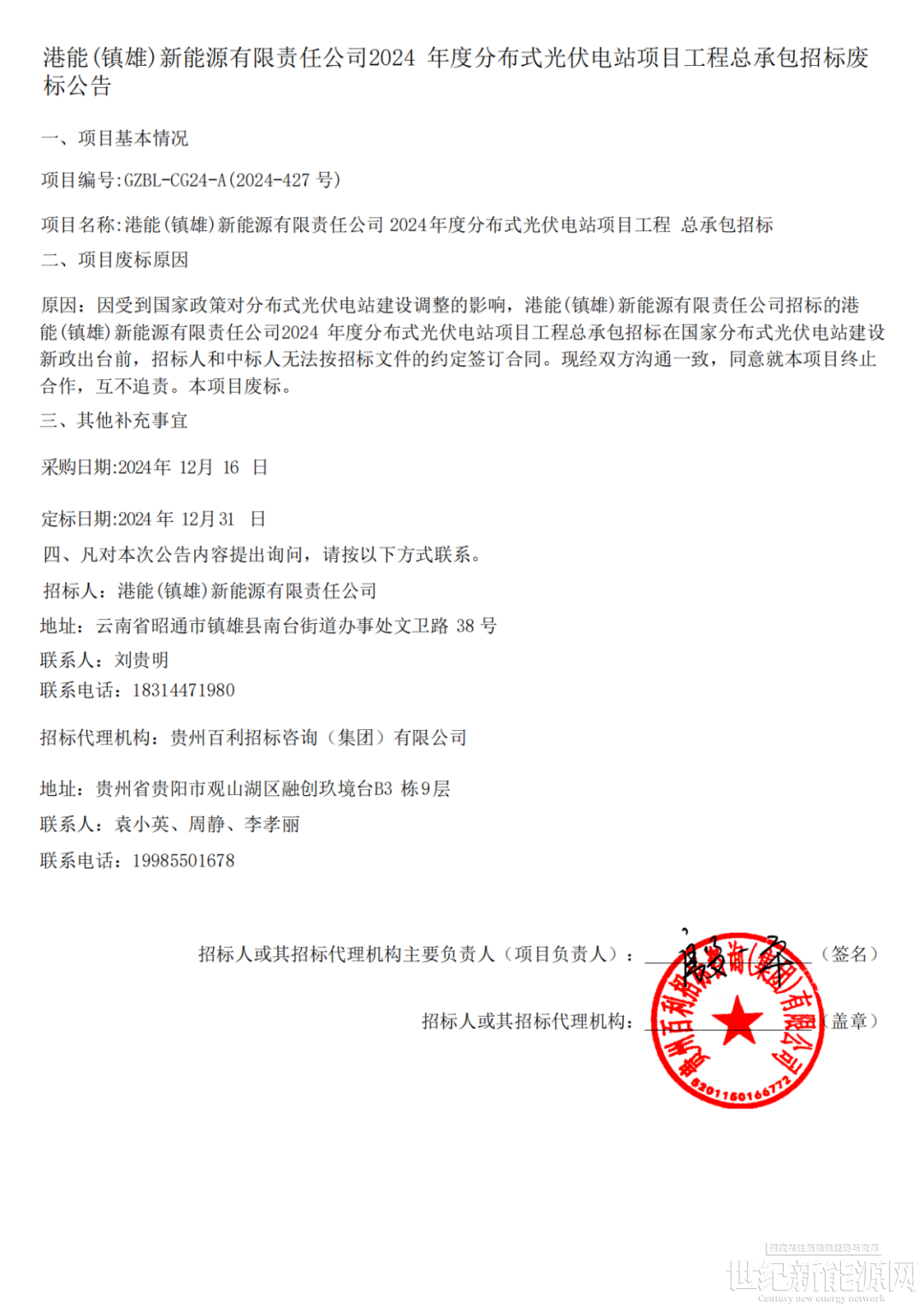 根据公告,因受到国家政策对分布式光伏电站建设调整的影响,港能(镇雄)招标的2024年度分布式光伏电站项目工程总承包招标在国家分布式光伏电站建设新政出台前,招标人和中标人无法按招标文件的约定签订合同。现经双方沟通一致,同意就本项目终止合作,互不追责。本项目废标。