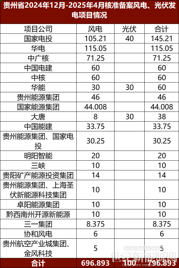 4月24日,贵州省能源局发布2024年12月-2025年4月核准备案风电光伏发电项目情况。根据文件显示,贵州省能源局2024年12月-2025年4月核准备案风电、光伏发电项目94个。其中光伏项目7个,项目容量合计100万千瓦;风电项目87个,项目容量合计为696.89万千瓦。