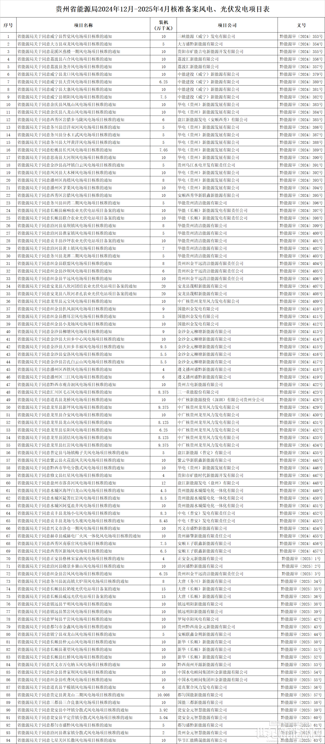 根据《省人民政府关于印发贵州省企业投资项目核准和备案管理办法的通知》(黔府发〔2018〕第7号),按照程序,贵州省能源局2024年12月-2025年4月核准备案风电、光伏发电项目94个,现将有关情况公布如下。