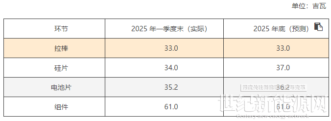 根据公告,CSIQ2025年第二季度预计总收入在19亿至21亿美元(折合人民币约136.4亿至150.8亿元)之间,毛利率预计在23%至25%之间,全年预计总收入在61亿至71亿美元(折合人民币约438.0亿至509.8亿元)之间。CSIQ2025年二季度预计组件出货量在7.5至8.0吉瓦之间,全年预计在25至30吉瓦之间(考虑目前光伏产品市场价格因素,公司在价与量之间做了平衡与取舍)。CSIQ2025年二季度预计储能系统出货量在2.4至2.6吉瓦时之间,全年预计在7.0至9.0吉瓦时之间。与此同时,CSIQ更新了光伏制造业各环节产能计划如下: