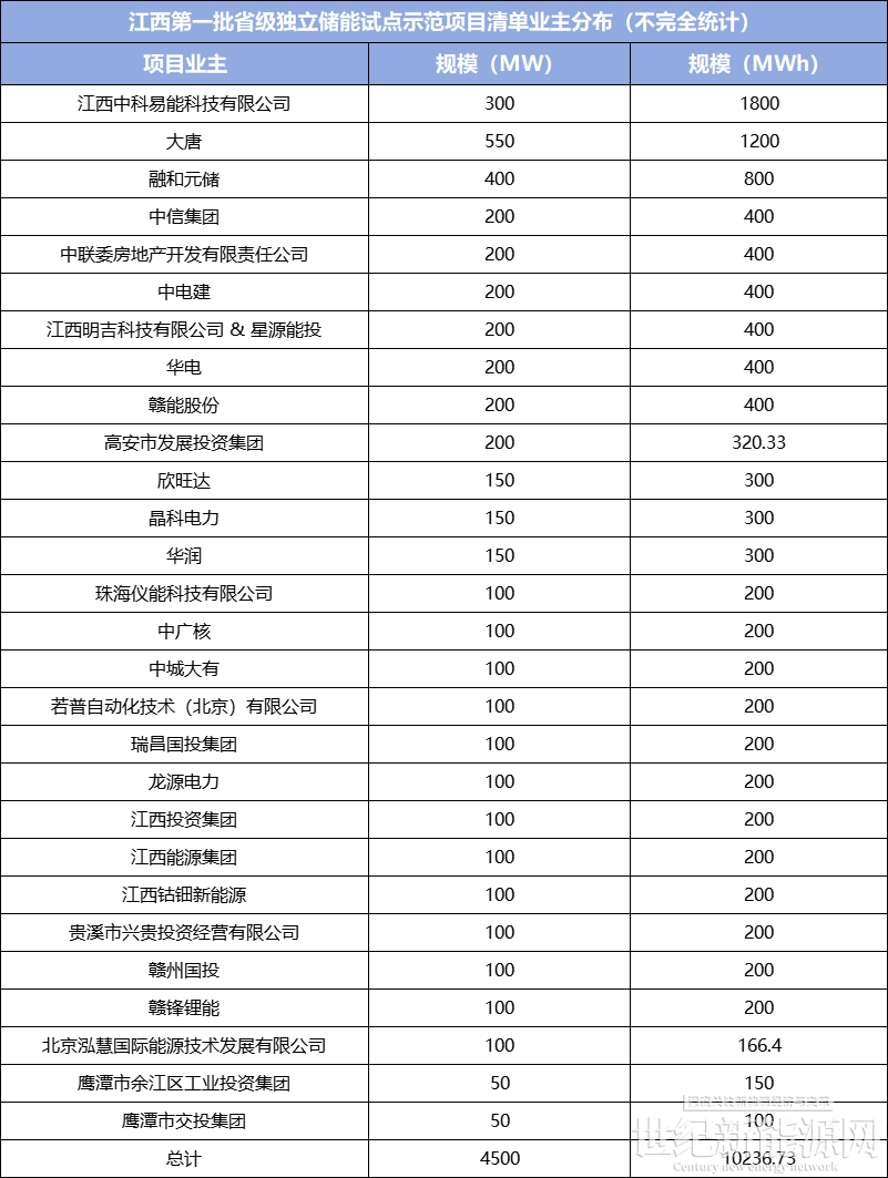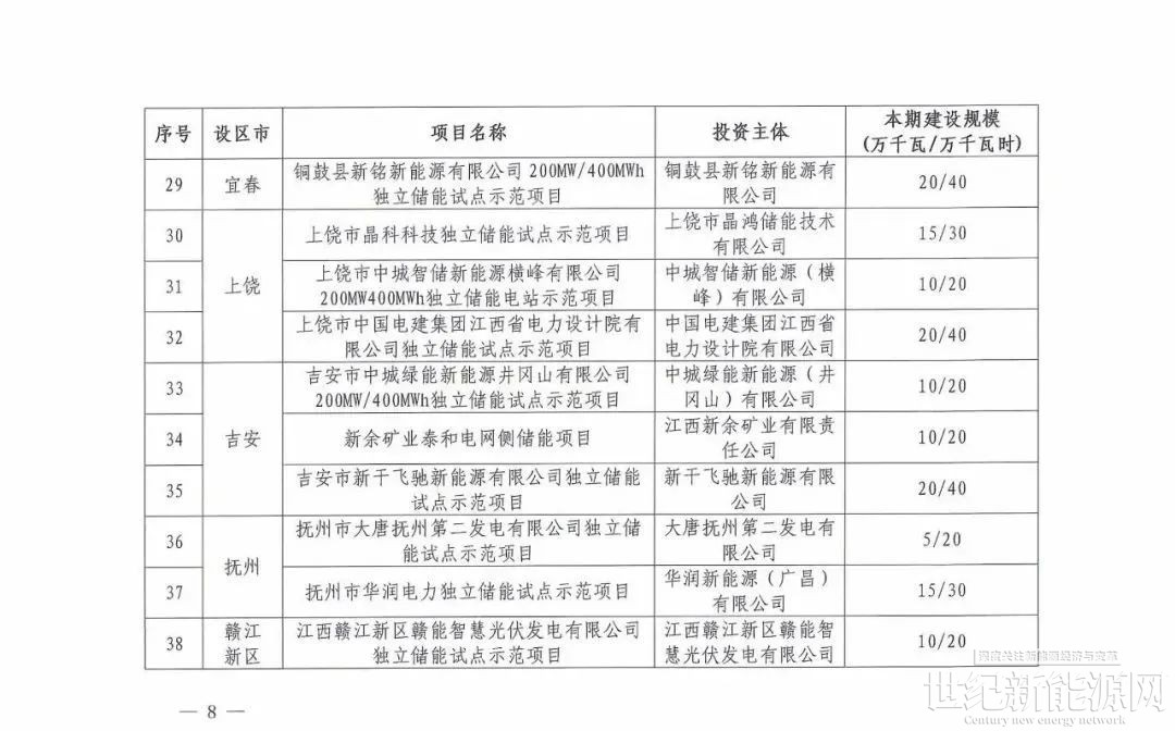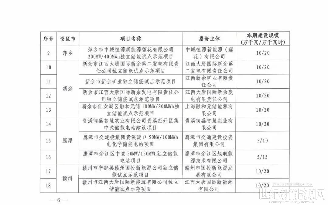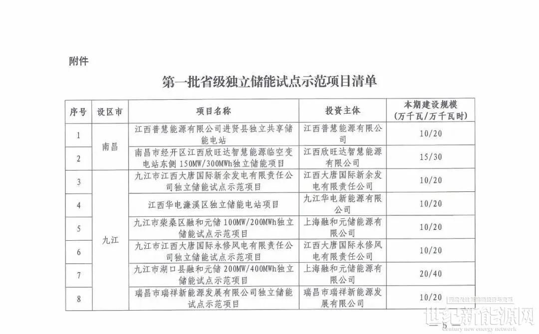 江西第一批省级独立储能试点示范项目清单