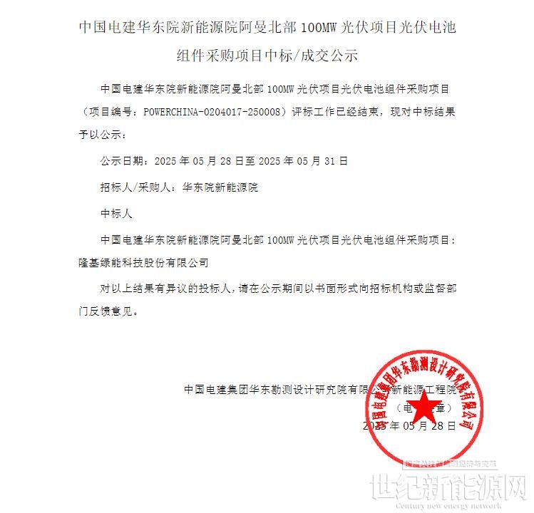 5月28日,中国电建华东院新能源院阿曼北部100MW光伏项目光伏电池组件采购项目成交公示。