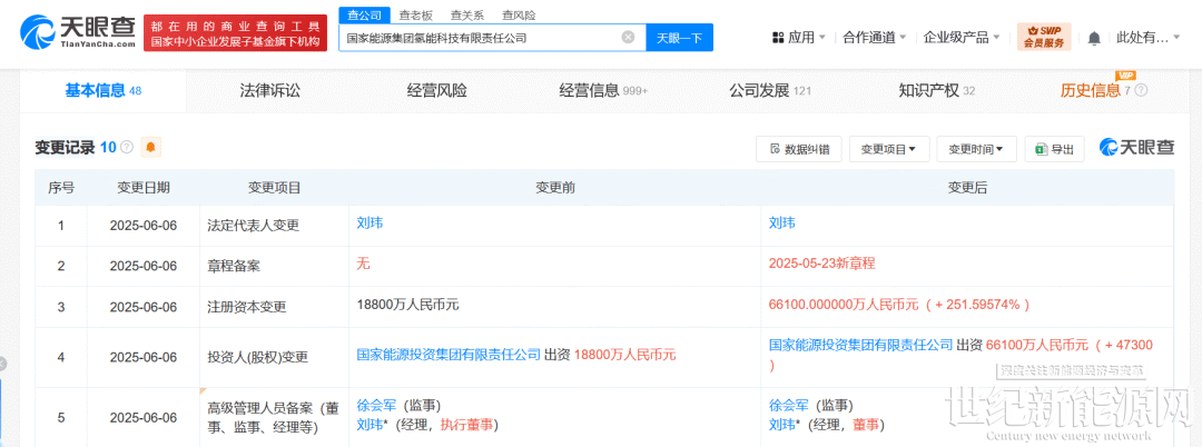 近日,国家能源集团氢能科技有限责任公司发生工商变更,注册资本由1.88亿人民币增至6.61亿人民币,增幅约252%,同时,刘玮由执行董事改任董事,任担任经理一职。