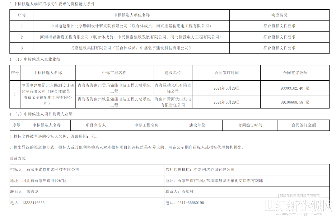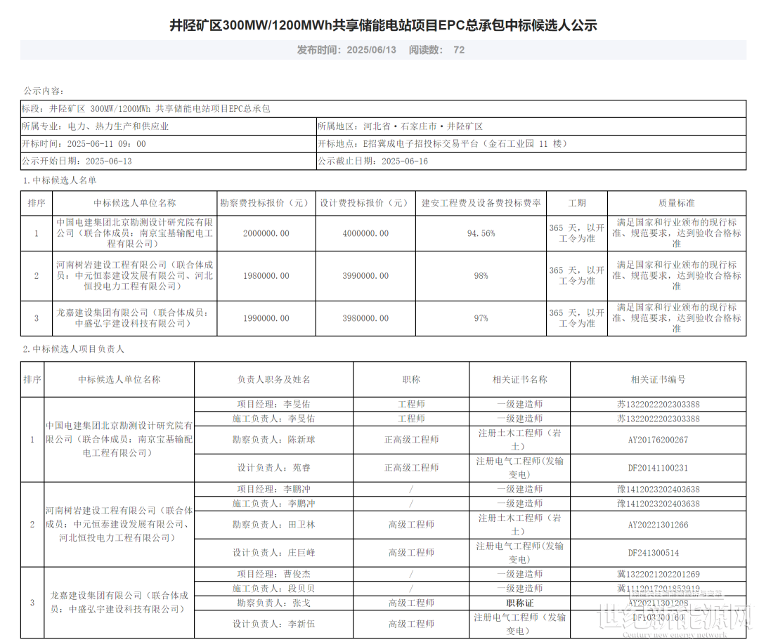 6月13日,石家庄井陉矿区300MW/1200MWh共享储能电站项目EPC总承包中标候选人公示。